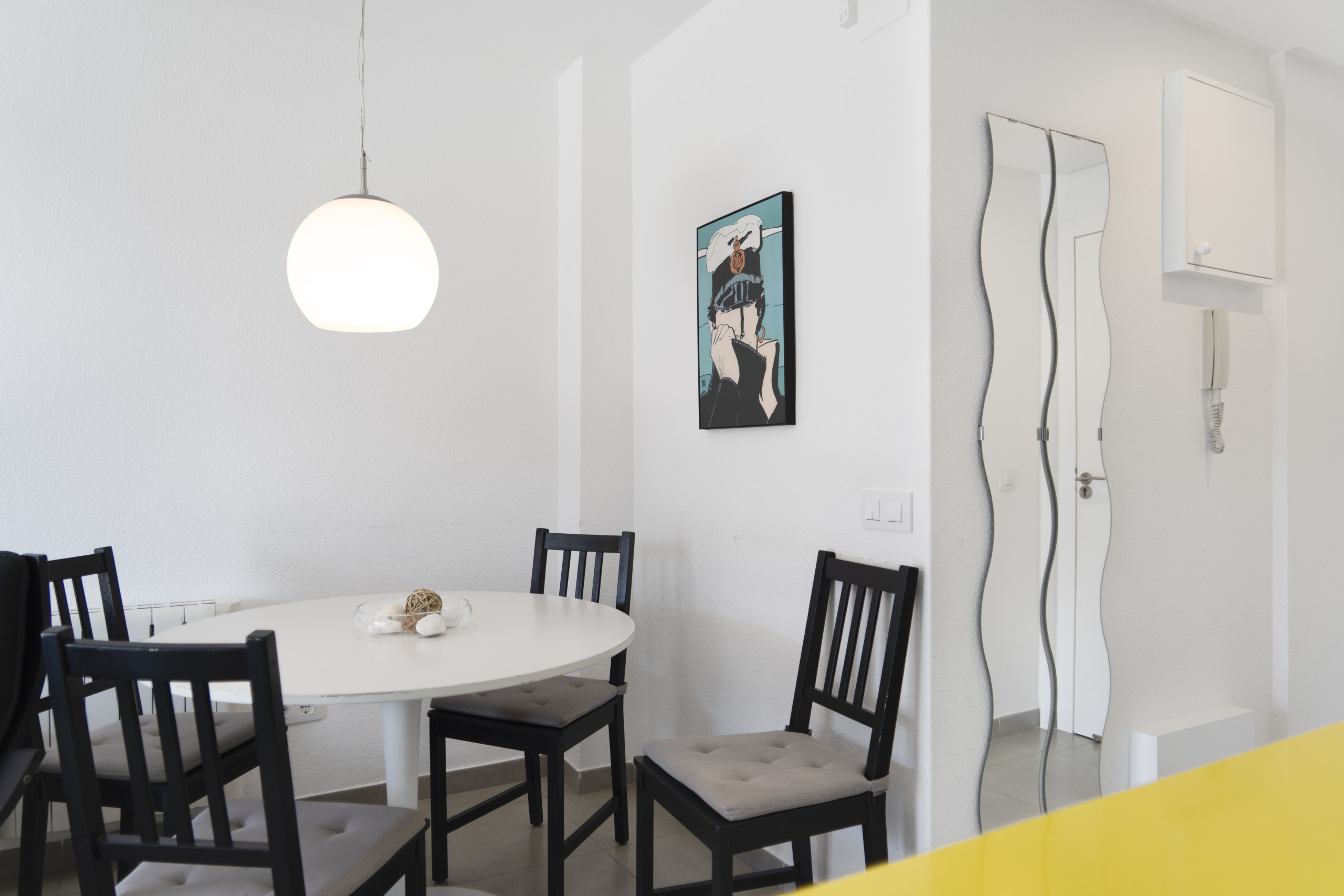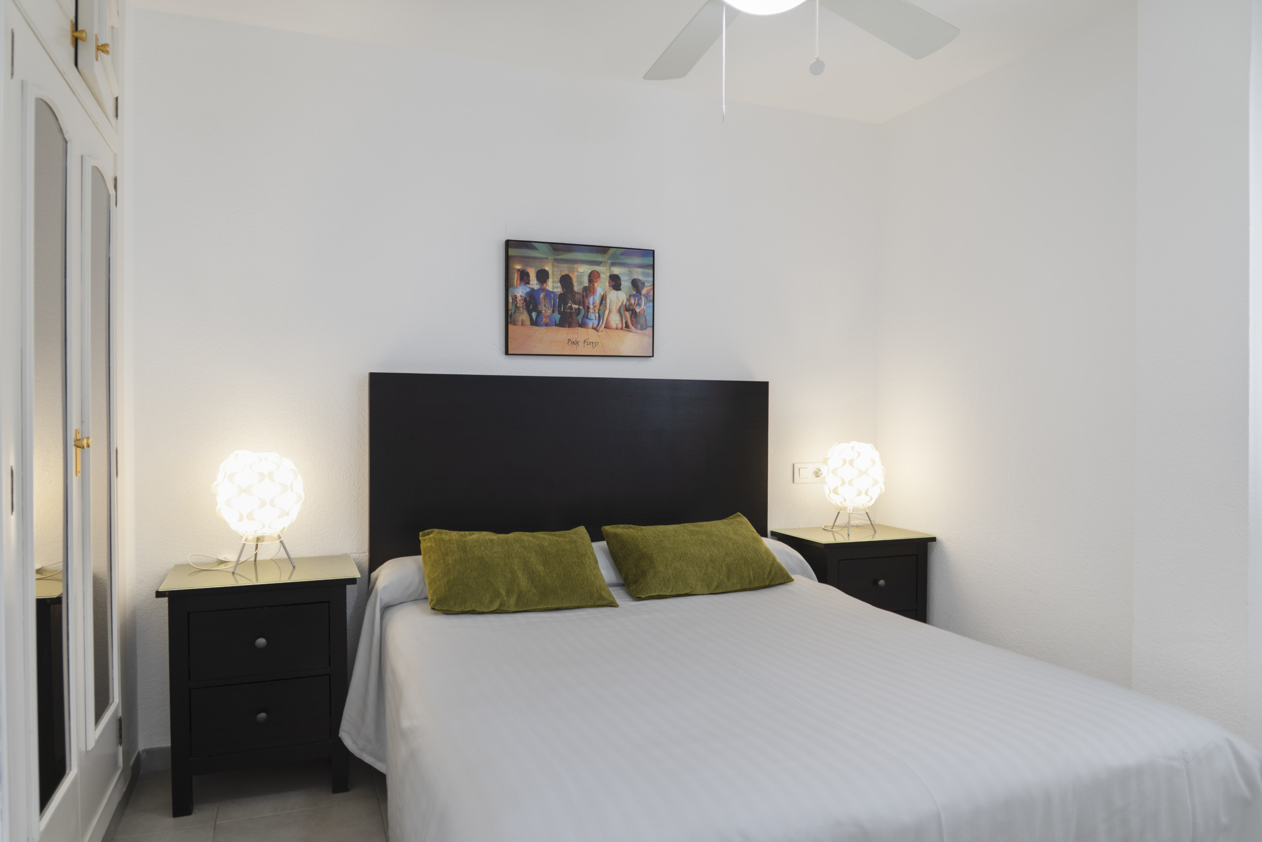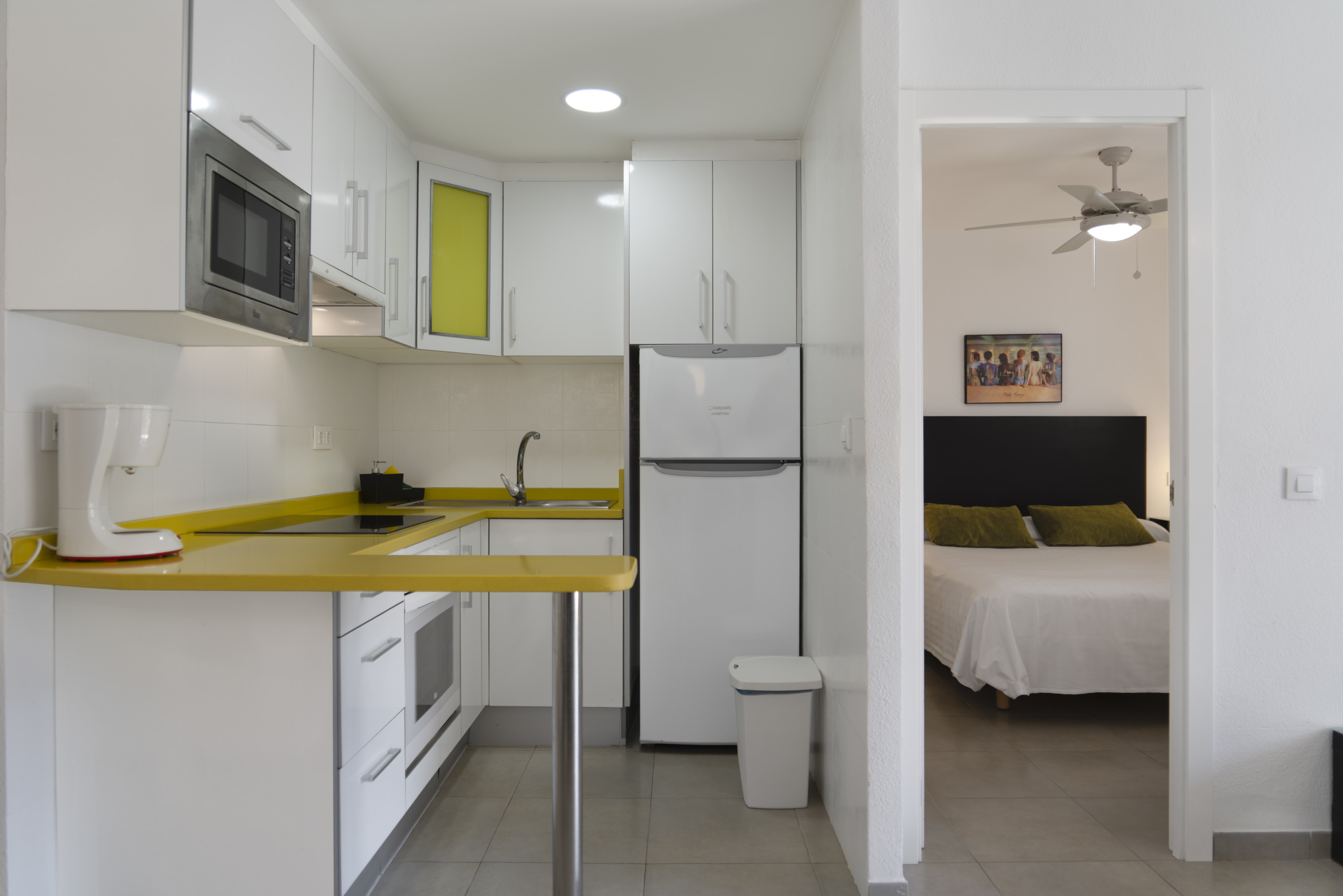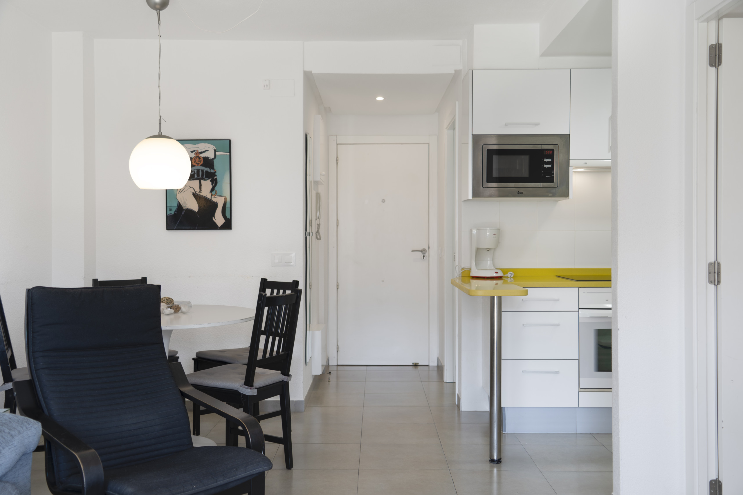 El apartamento posee 1 dormitorio y 1 baño. Cocina americana totalmente equipada con vitrocerámica, cafetera, tostador, exprimidor de zumo, batidora, horno, microondas, lavadora, hervidor de agua, plancha y tabla de planchar...