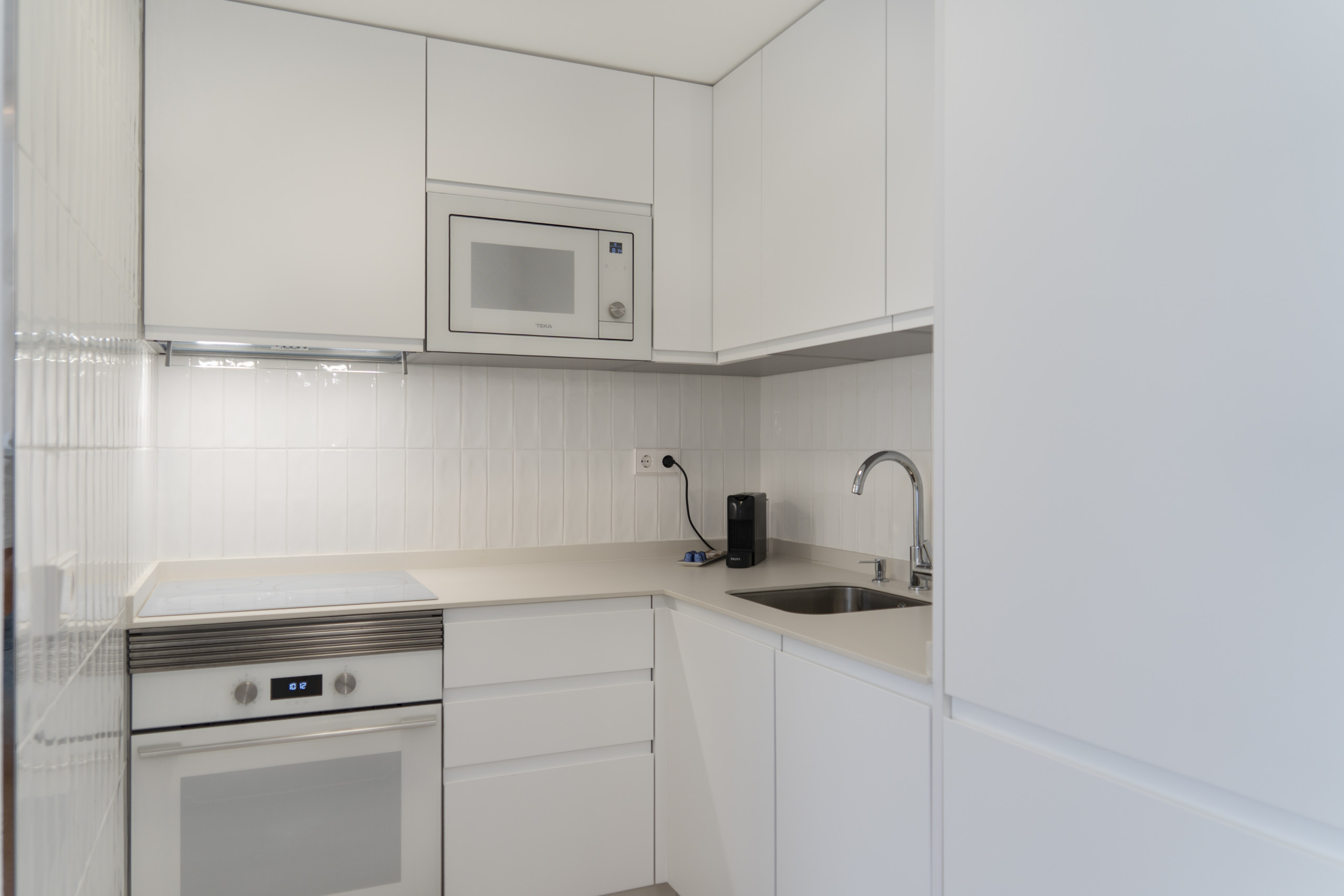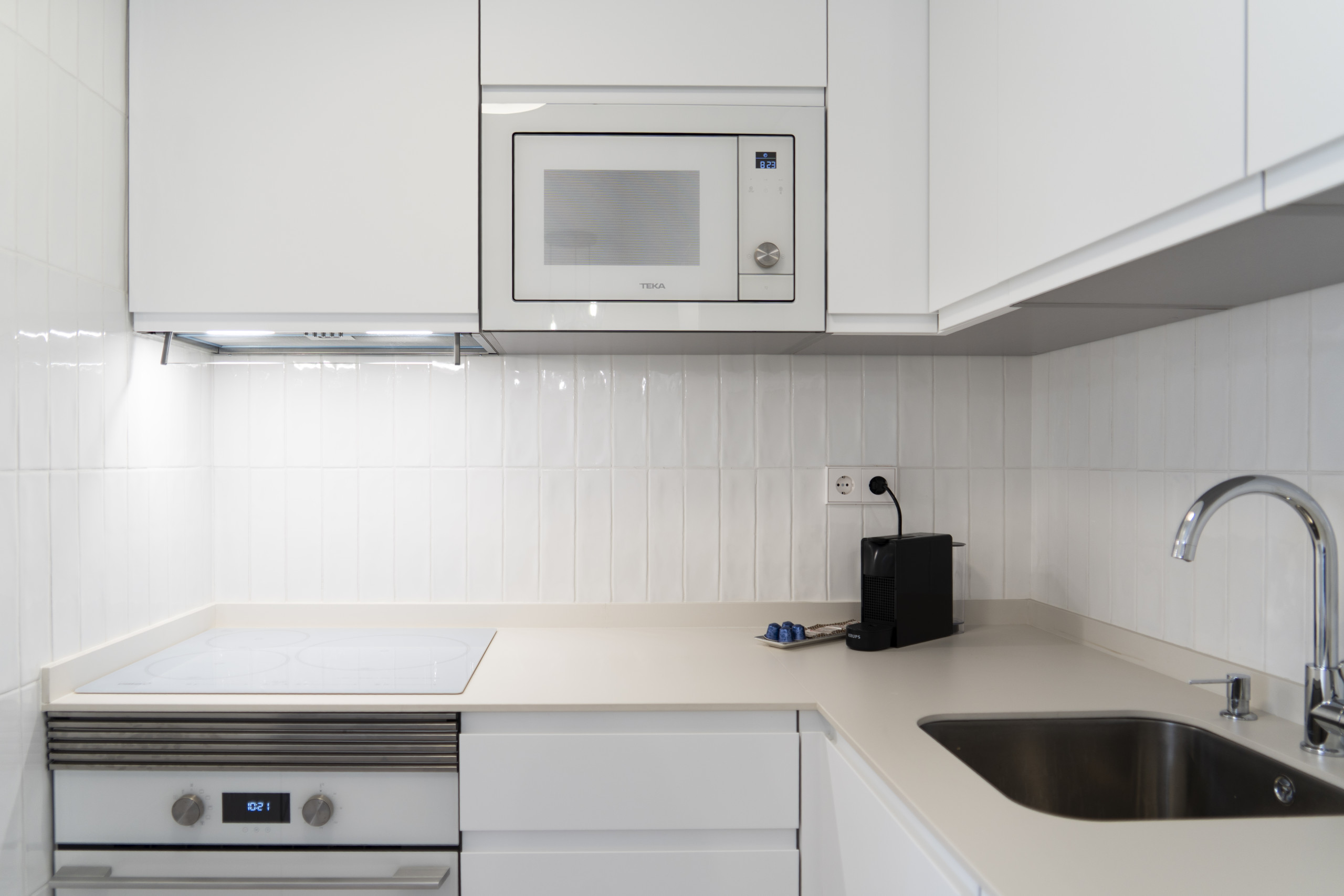 In the hotplate of glass ceramics open plan kitchen, refrigerator, microwave, oven, freezer, dishwasher, dishes/cutlery, kitchen utensils, coffee machine, toaster, kettle and juicer are provided.